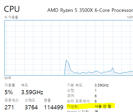 작업관리자에서 가상화를 확인해보니까 꺼져있었다 ...